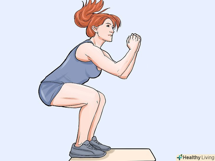 Робіть стрибки на ящик. це ще одна хороша вправа, яку Ви можете робити з мінімальним обладнанням, і воно добре підходить для нарощуючи литкового м'яза. Станьте перед ящиком, так, щоб ви легко могли на нього застрибнути. Чим вище ящик, тим складніше буде на нього застрибнути. Починайте з пальців ніг, спрямованих до ящика. Пригніть ривком і застрибніть повністю на ящик, так, щоб ваші ступні теж були на ньому. Зістрибніть назад на підлогу. Повторивши.- Переконайтеся в тому, що ящик досить важкий, і він не буде ковзати, коли ви застрибніть на нього.