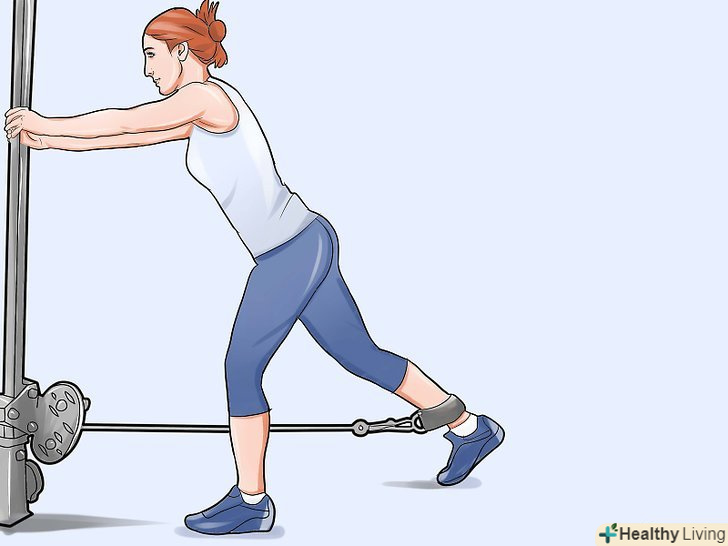 Робіть згинання ніг стоячи. це ще одна вправа, для виконання якого потрібен тренажер. Вам знадобиться тренажер Leg Curl, який дозволяє піднімати тяжкості шляхом приєднання кабелю до щиколотки. Завантажте машину такою вагою, яку Ви можете підняти близько 10 разів, від 20-50 Фунтів (або більше).- Закріпіть трос з манжетою на щиколотці і візьміться за опорний поручень руками.