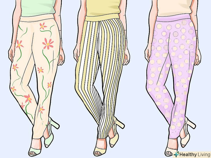 Шукайте колготки та штани з візерунками. перейдіть на колготки і штани з квітковими візерунками, в смужку, горошок або які пофарбовані технікою тай-дай - чим більше квітів, тим краще. Коли ви носите речі з візерунками, вони візуально роблять ваші ноги більше, носіння темних, чистих кольорів, може зробити ваші ноги візуально тонкими і маленькими.