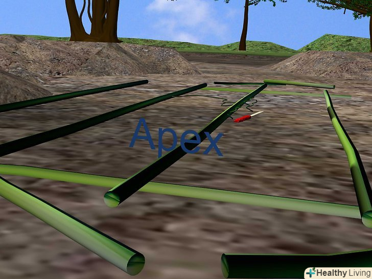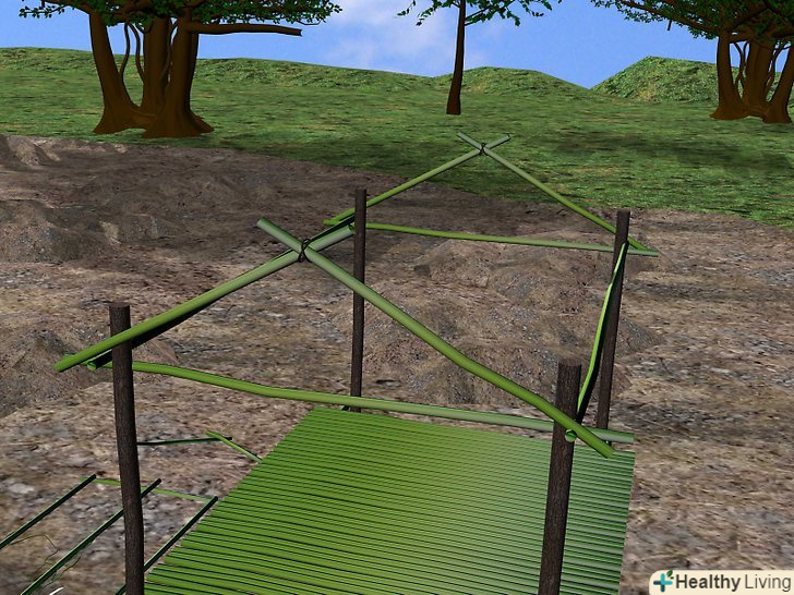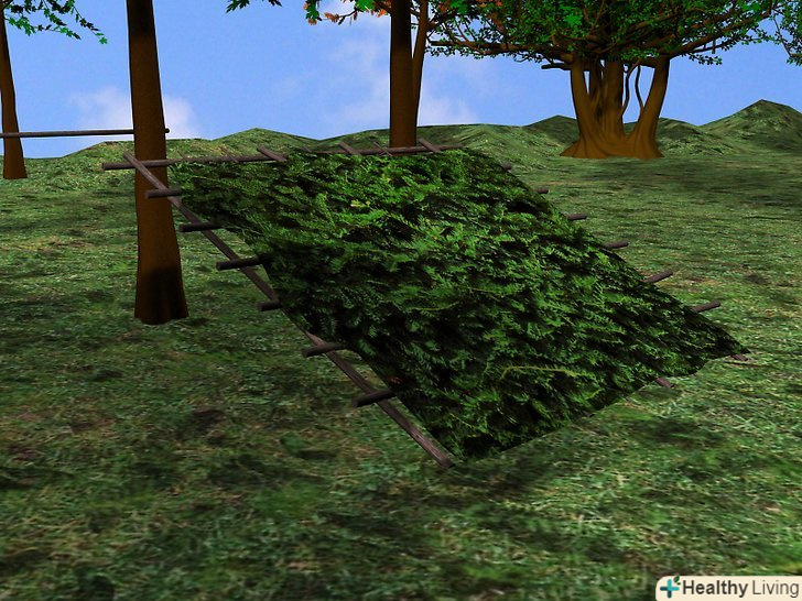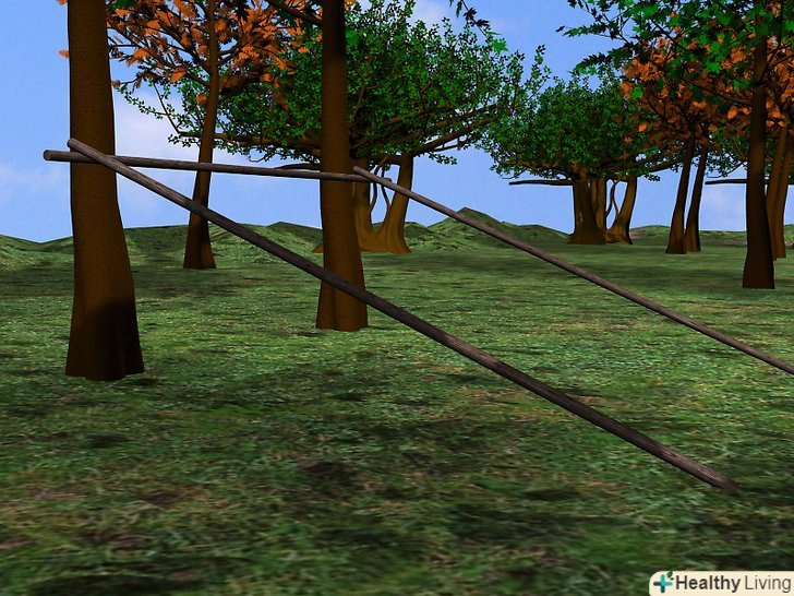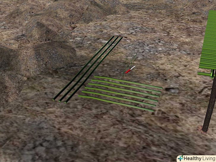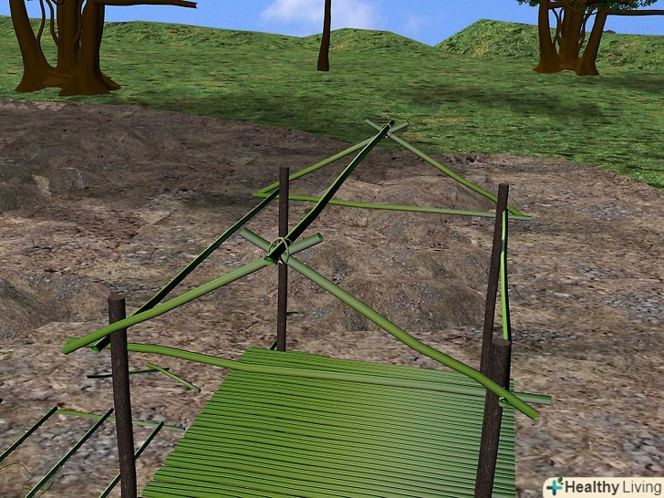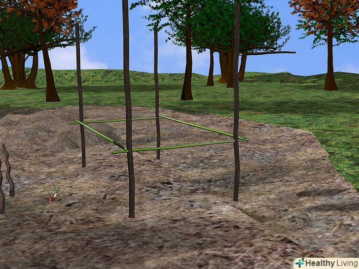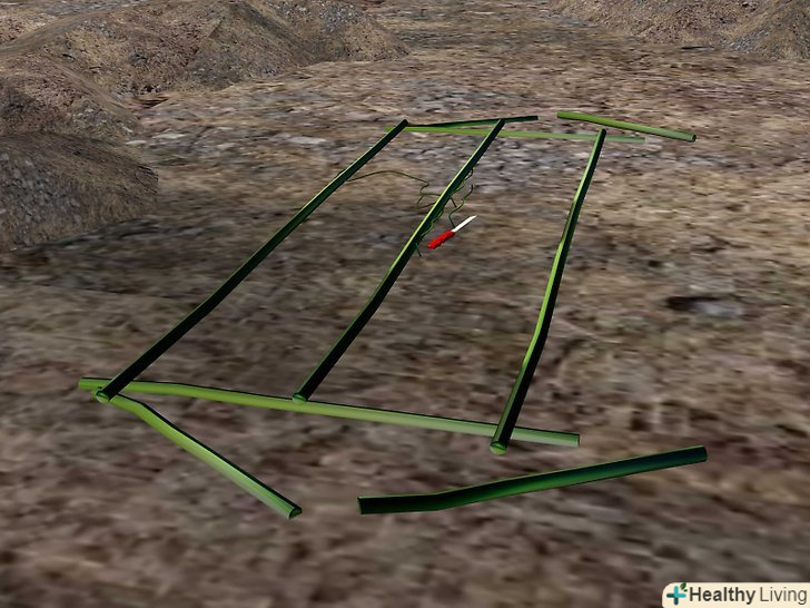 Побудуйте опорну раму з гілок як зазначено на малюнку. довжина укриття повинна покривати Вас з голови до ніг; підходить довжина близько 2 метрів. Щільно зв'яжіть гілки разом, щоб вони витримали вагу всього укриття.