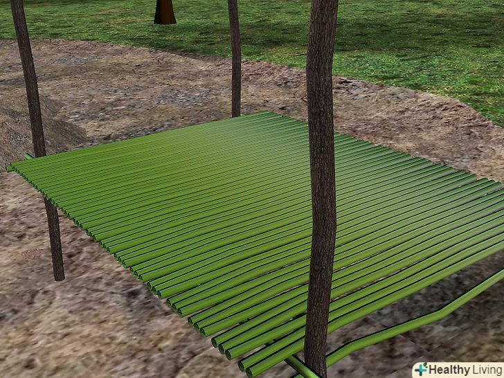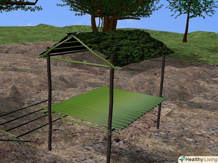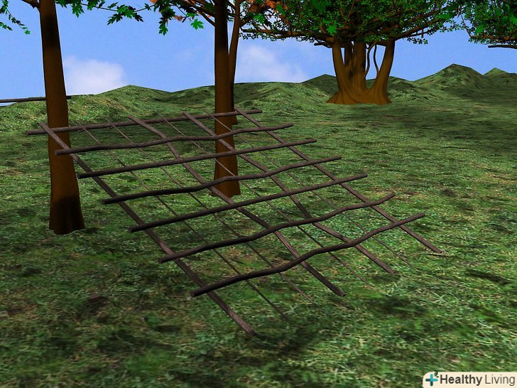 Зробіть настил або лежанку для сну в курені. зберіть з десяток прямих гілок діаметром в 5 см і на 60 см довше ширини укриття. Розташуйте їх уздовж поперечок бічної рами, щоб сформувати підставу для ліжка і зв'яжіть їх разом.