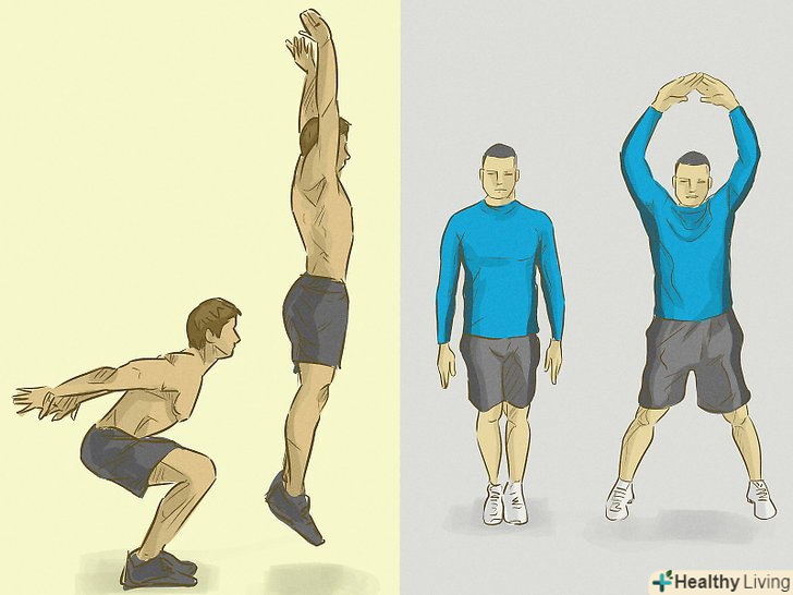 СтрибайтеЯкомога вище! стрибки корисні для збільшення щільності кісткової тканини. Недавнє дослідження показало, що у жінок в постменопаузі, які займаються стрибками хоча б два рази на день (по 10 стрибків), щільність кісткової тканини починає поступово збільшуватися. [41]- Встаньте босоніж на підлогу або іншу тверду поверхню. Підстрибніть якомога вище. Потім зробіть невелику перерву (кілька секунд) і повторіть стрибок.