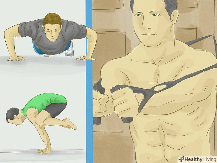 Зміцнюйте м'язи. як вже говорилося вище, робота м'язів дозволяє зміцнити кістки і підтримати їх щільність. [42]- Тому для зміцнення кісток відмінно підійдуть силові тренування, вправи з розтягуванням гумових стрічок для занять спортом, а також віджимання і присідання.