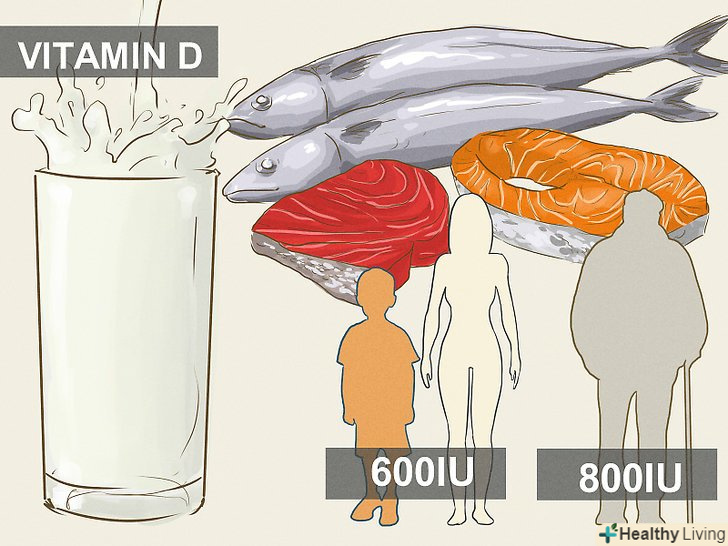 Споживайте більше вітаміну D. цей вітамін сприяє кращому засвоєнню кальцію організмом. Він також відіграє важливу роль у регенерації кісткової тканини. [11] Люди у віці від 70 років і старше повинні споживати близько 0,015 мг на добу. [12] якщо у вас дефіцит вітаміну D, лікар призначить вам аналізи, щоб визначити рекомендовану дозу.- Вітамін D присутній далеко не у всіх продуктах харчування. Кращими джерелами вітаміну D є: жирна риба (риба-меч, тунець, скумбрія), а також яловича печінка, сир, гриби, яєчний жовток. [13]