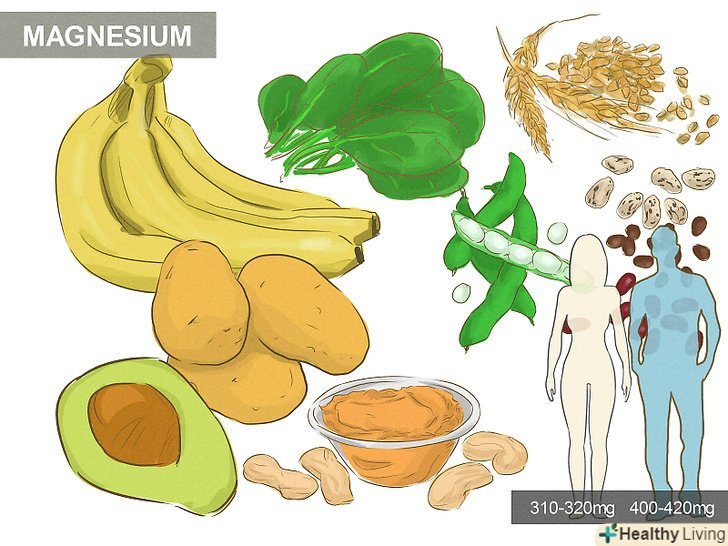 Споживайте продукти, що містять магній. магній – важливий мінерал для всього організму, зокрема для кісток. Близько 50-60% магнію міститься в кістках. Зараз у багатьох спостерігається недолік магнію. Чоловікам рекомендується споживати 400-420 мг магнію на добу, а жінкам – 310-320 мг. [16] магнієм багаті багато продуктів:- Мигдаль, кешью, арахіс, арахісове масло