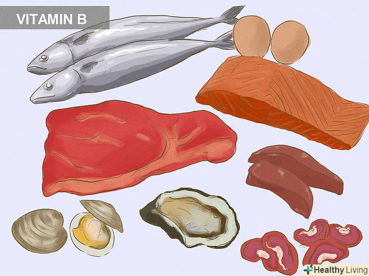 Намагайтеся віддавати перевагу продуктам, в яких високий вміст вітамінів групи В. дефіцит вітаміну В12 викликає зниження кількості остеобластів (клітин, які відповідають за регенерацію кісткової тканини). У людей з нестачею вітаміну В12 частіше трапляються переломи кісток. [18] дорослим рекомендується споживати 2,4 мкг вітаміну В12 на добу. Ось деякі джерела цього вітаміну: [19] [20]- М'ясо (печінка і нирки)