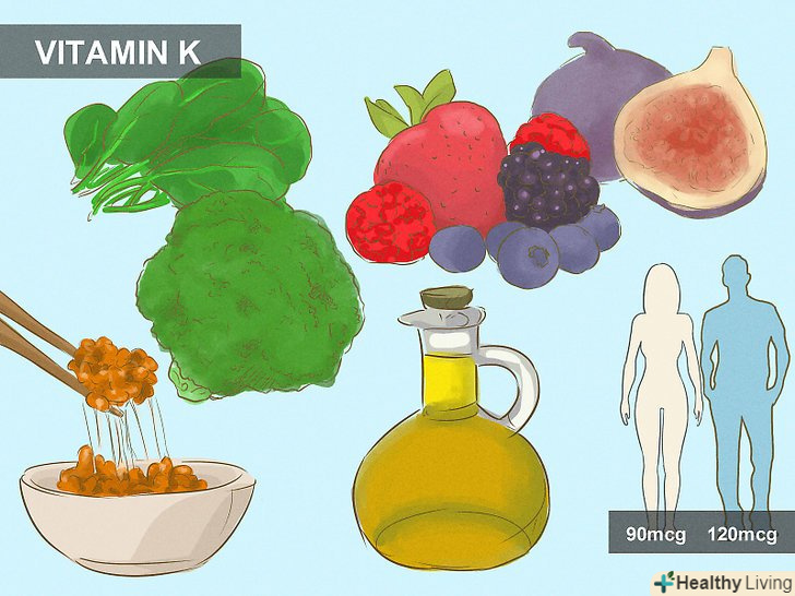 Споживайте достатню кількість вітаміну К. Вітамін К підвищує щільність кісткової тканини і знижує ризик переломів. [27] [28] чоловікам рекомендується споживати близько 120 мкг вітаміну К на добу, а жінкам – близько 90 мкг. Зазвичай Вітамін К надходить в організм з продуктами харчування, але майте на увазі, що вітамін К також синтезується кишковою мікрофлорою. [29] ось джерела вітаміну К: [30]- Зелені листові овочі (шпинат, капуста, брокколі, ріпа)