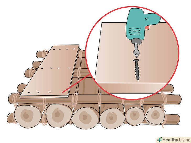 - Примітка: Якщо ви хочете більше стабільності, залишатися якомога вище над водою і брати з собою більше речей, то побудуйте Понтонний пліт, який схожий на катамаран! Виконайте ті ж дії, що і вище, але зробіть дві вузькі, високі секції. Скориставшись морськими болтами, прикріпіть або шматок товстої фанери, або декількох дощок до кожної зв'язці колод.