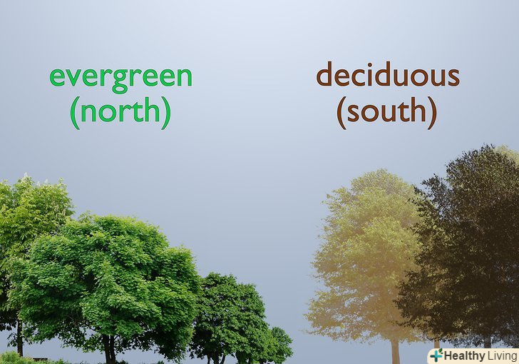 Шукайте наступні ознаки напрямки:- Листяні дерева як правило ростуть на південних схилах пагорбів, а вічнозелені - на північних.