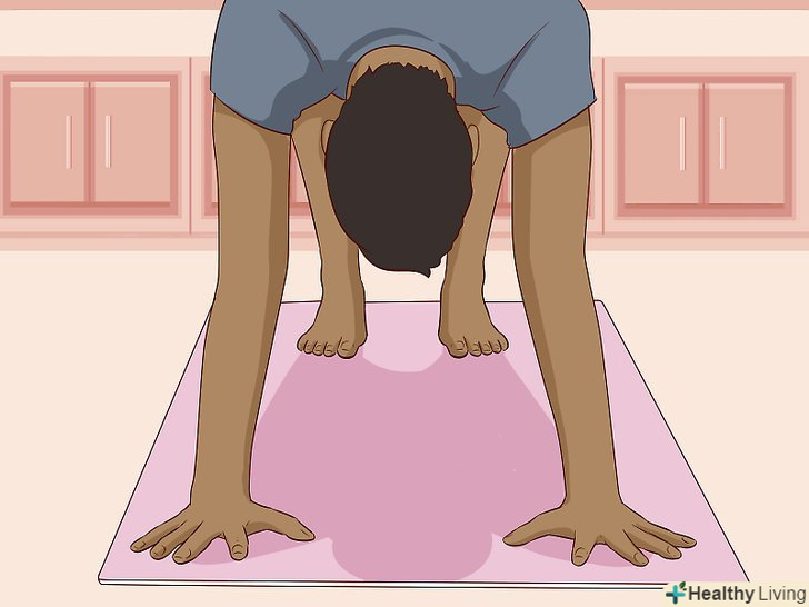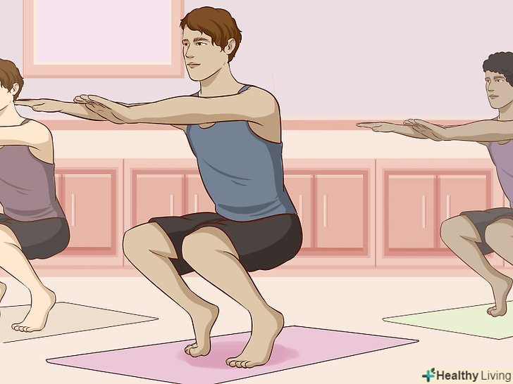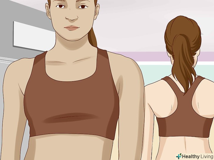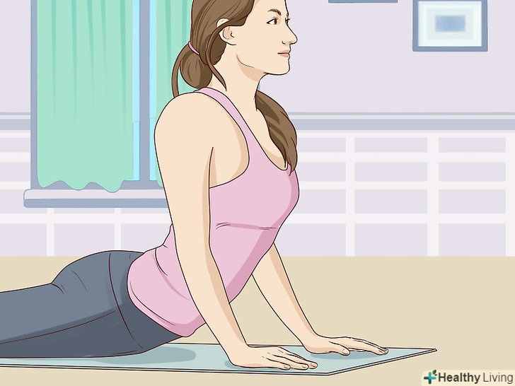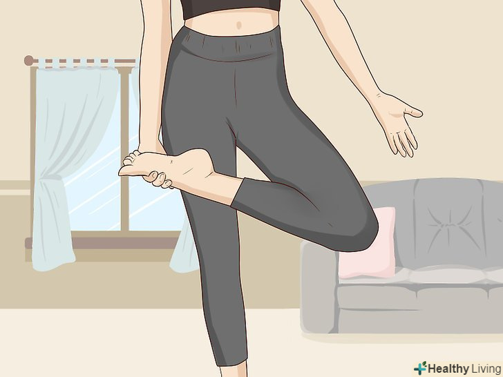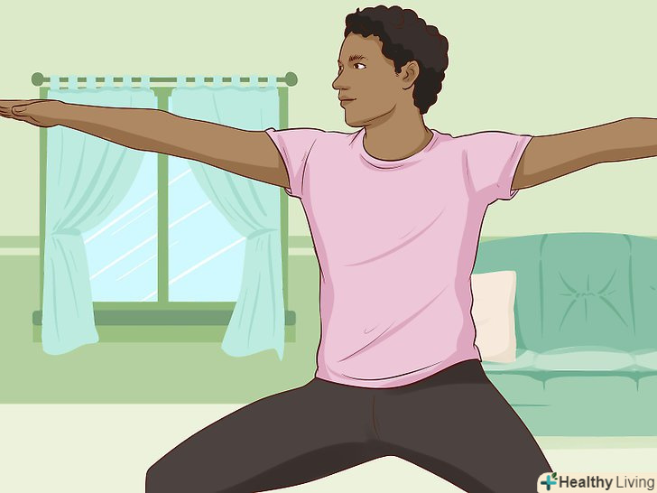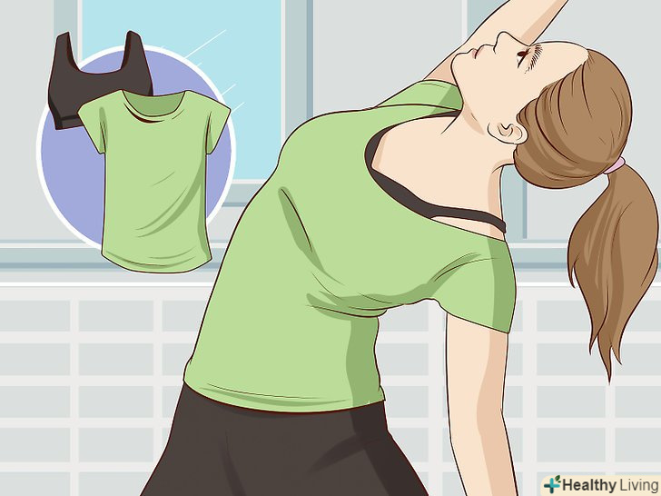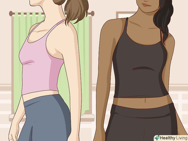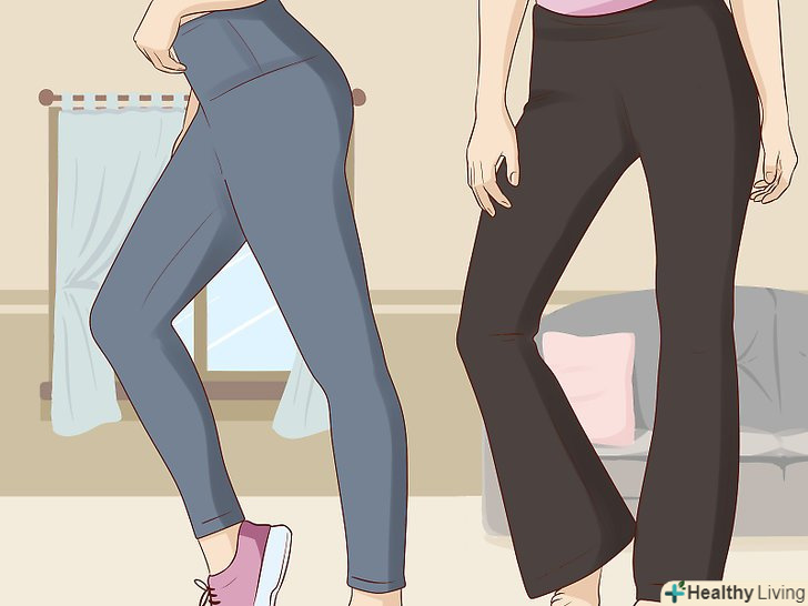 Одягніть штани для йоги. їх легко знайти в будь-якому спортивному магазині, в якому продається одяг. Вони бувають різних кольорів, так що ви можете вибрати ті, що підкреслять вашу індивідуальність. Спробуйте виконати кілька випадів і розтяжок в примірювальній, щоб переконатися, що штани не сковують ваші рухи. Ви можете також надягати їх і для інших спортивних тренувань, наприклад, для бігу або їзди на велосипеді.- Довгі штани для йоги краще підходять для занять, в яких немає швидких рухів, так як зайва тканина може заважати.