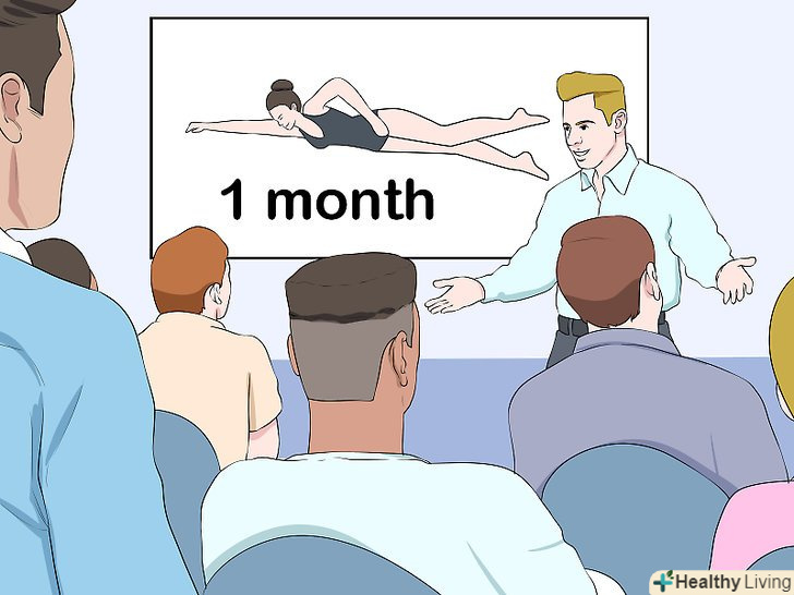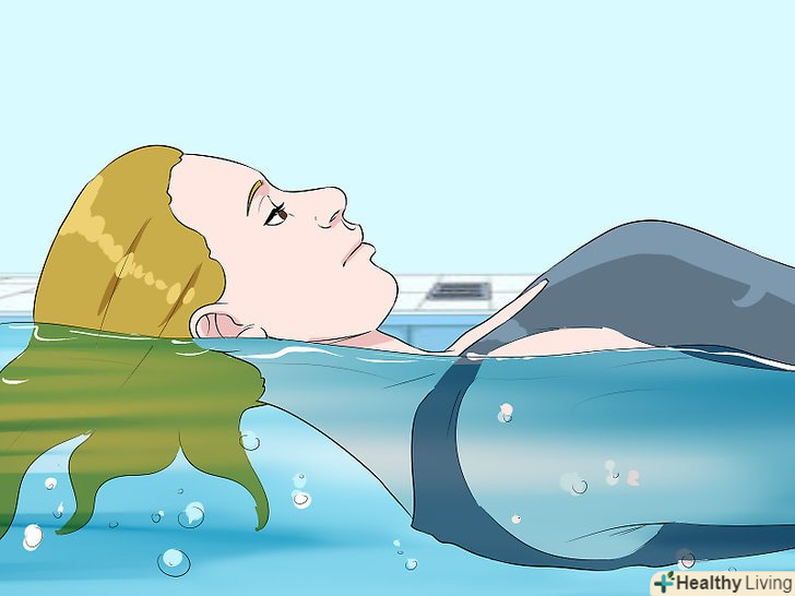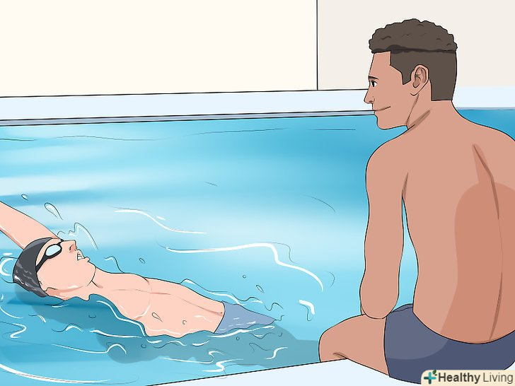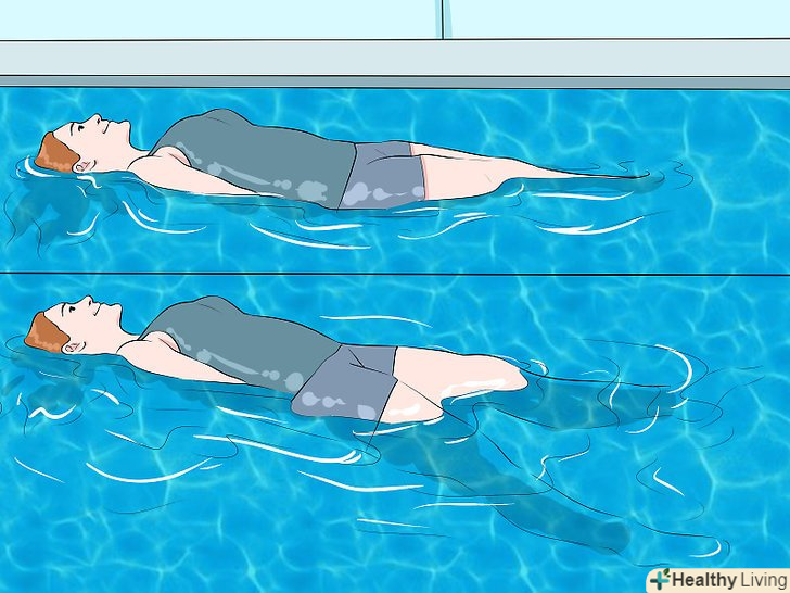 Для початку навчіть людинуПлавати на спині . почніть з простого стилю, наприклад, з плавання на спині. Ця техніка в значній мірі полягає в утриманні тіла на воді, і тут не потрібно безлічі химерних рухів, які потрібно відточувати з часом. Як тільки ваш дорослий учень навчиться триматися на спині, можна переходити до навчання рухів рук і ніг. [11]- Попросіть учня триматися за стіну за головою, поки він лежить на спині, а потім скажіть йому виконати пурхає рух ногами. Це буде відмінним способом звикнути до рухів.
