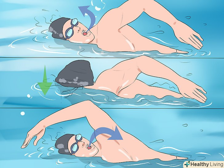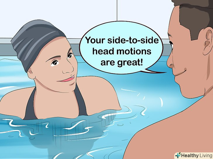 НавчітьВільному стилю плавання . це один з найпоширеніших стилів, тому це відмінна відправна точка для початківців дорослих учнів. Як тільки ваш учень почне впевнено пурхати ногами у воді, тримаючись за стіну, приступайте до навчання правильним дихальним технікам. Попросіть його опустити обличчя в воду, повернути голову вправо і зробити вдих, потім знову опустити голову і видихнути під водою, а потім повернути голову вліво і вдихнути. Практикуйте ці рухи знову і знову, поки учень не освоїться. [12]- Потім спробуйте додати руху руками, навчивши учня пурхати ногами, одночасно піднімаючи одну руку над головою і опускаючи її в воду. Як тільки він опанує цим, можна почати синхронізувати дихання з рухами рук.