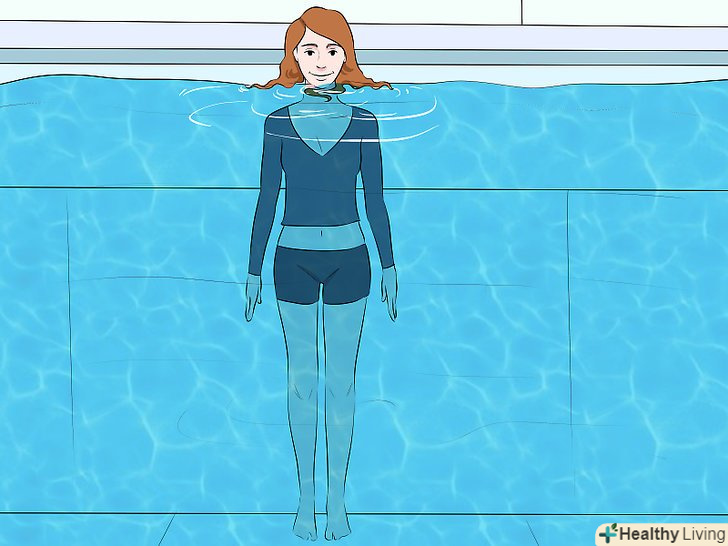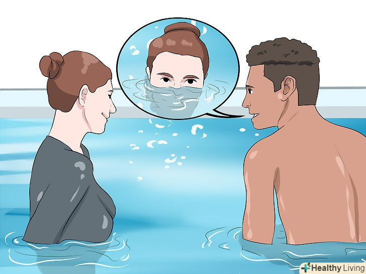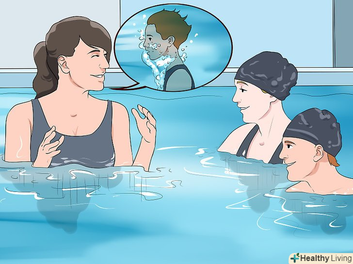 Дайте вказівки учневі Увійти по щиколотку в воду. попросіть його увійти в дрібну частину басейну і залишитися там по щиколотку в воді. Він може ходити, плескатися або стояти на місці (робити все, що йому найбільш комфортно). Дозвольте йому залишатися в цьому положенні стільки, скільки він захоче. [6]- Як варіант, учень може сидіти на краю басейну і базікати ногами у воді.