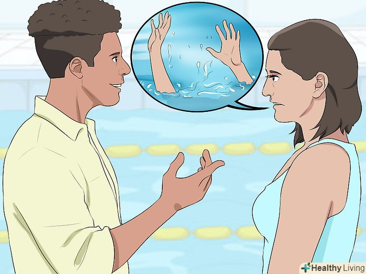 Обговоріть будь-які можливі страхи, пов'язані з плаванням. цілком можливо, що причина, по якій ваш учень досі не навчився плавати, полягає в страху перед водою або в боязні потонути. У такому випадку важливо, щоб учень поділився з вами цією інформацією, щоб ви знали, як підлаштувати стиль навчання. [4]- Наприклад, якщо людина боїться води, швидше за все, йому буде потрібно більше часу, щоб звикнути просто перебувати у воді або мочити обличчя.