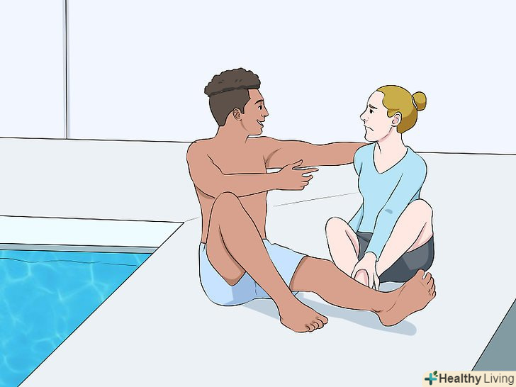 Встановіть довіру за межами води. коли людина відчуває страх перед водою, йому часто кажуть, що боятися нічого. Але так як він боїться , то з простими підбадьорюваннями ви лише впадете в його очах. Встановіть довіру поза водою, де людина відчуває себе більш комфортно. Завдяки цьому він почне вірити вам і буде впевненіше слідувати вашим вказівкам у воді. [5]- Почніть уроки за межами басейну, допомагаючи людині навчитися правильно розтягуватися перед плаванням.