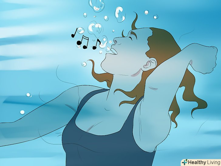 Переконайте його намочити обличчя. Одна з перших речей, яку необхідно зробити дорослим плавцям, — це звикнутися з зануренням особи в воду. Як тільки вони це зроблять, інші етапи пройдуть набагато швидше. [8]- Запропонуйте учням співати у воді. Так вони будуть виштовхувати повітря в воду і зрозуміють, як це — видихати бульбашки, коли особа знаходиться під водою.