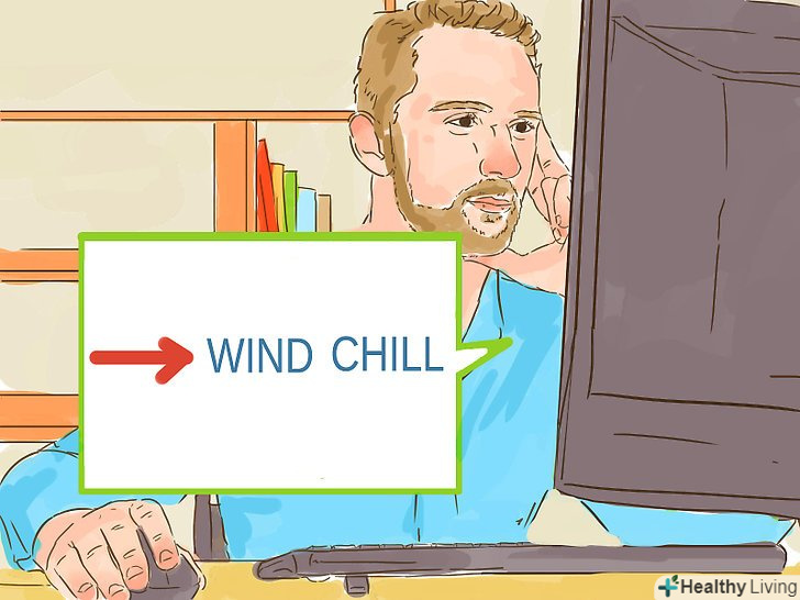 Звертайте увагу на охолоджуючий ефект вітру. охолоджуючий ефект вітру складається з фактичної температури і сили вітру і впливає на відчутну температуру повітря. Якщо, перевіряючи прогноз погоди, Ви будете звертати увагу не тільки на фактичну температуру, але і на охолоджуючий ефект вітру, то зможете приблизно уявити, як поточна температура буде "відчуватися" шкірою. [15]- Екстремальний зимовий вітер може зробити вуличну активність небезпечною, так як сильний вітер здатний проникати під одяг, збільшуючи ризик обмороження.