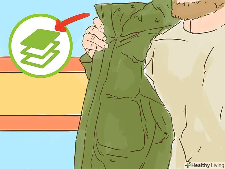 Одягайтеся в кілька шарів одягу. займаючись фізичним навантаженням, ви виділяєте багато тепла. Якщо вбратися занадто тепло, можна перегрітися, навіть якщо на вулиці холодно. Використання декількох шарів одягу дозволить вам зняти з себе зайве, коли фізичне навантаження стане більш інтенсивною. [8]- Почніть з тонкого шару одягу з синтетичного матеріалу. Вона буде відводити потові виділення вашого тіла. Підберіть собі верх з довгими рукавами і низ у вигляді легінсів (або кальсон).