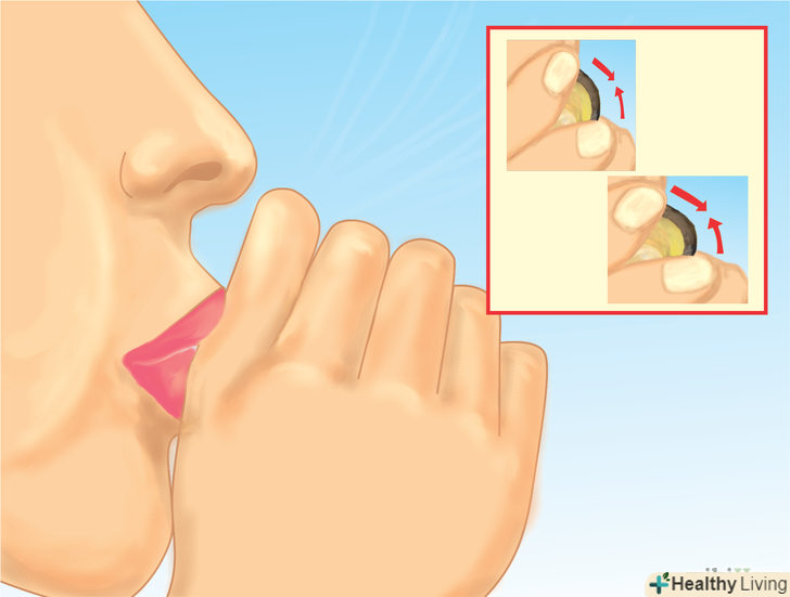 Покладіть верхню губу на суглоби ваших великих пальців. потім поставте ваші губи так, щоб коли ви дуєте, повітря не виходило з-під нижньої губи. Це найскладніша частина, так що вам потрібно буде потренуватися.