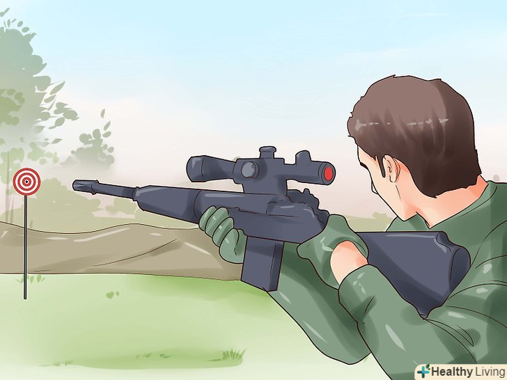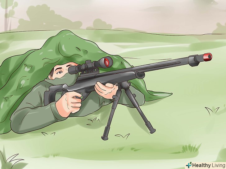 Практикуйте стрілянину. є кілька ключових моментів стрільби, які допоможуть вам, вбивайте, утримуйтеся від того, щоб бути ураженим і зберігати боєприпаси.- Виберіть ціль. Спочатку обміркуйте " чи можу я вразити цю мету?". Ви повинні пам'ятати, що страйкобольний BBs зазвичай має максимальний ефективний діапазон 200 футів (це часто верхня межа навіть хорошої зброї), і загальний ефективний діапазон 75-120 футів. Щоб вистрілити на максимальну відстань з вашого зброї, краще зробити пробний постріл, щоб бачити, який постріл ви будете робити наступним, якщо постріли все одно на недалеку відстань, то вам потрібно направляти зброю вгору, тим самим компенсувати зниження. Якщо вам здалося, що не виходить досягти потрібної відстані, постріли дальньої дії на цілі в межах перших 5-7 пострілів нічого не змінюють, страйкбольний BBs не передбачувані на великій відстані. Тому завжди знайте, як працює ваша зброя і наскільки точний з вас стрілок.