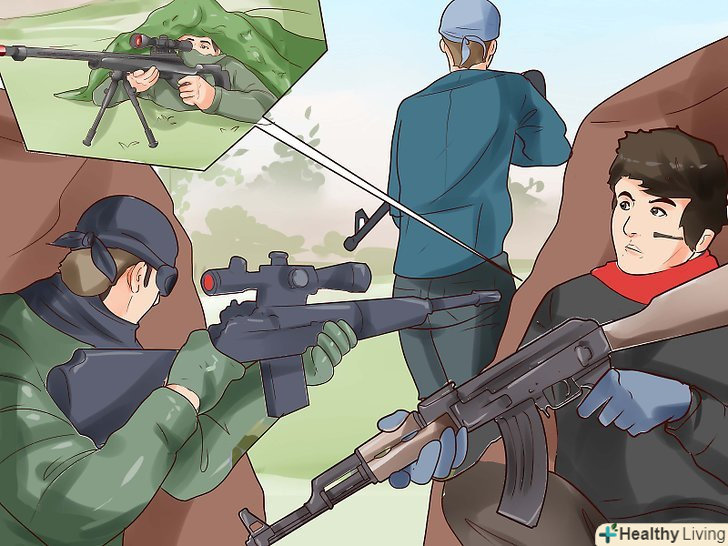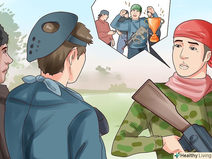 Виберіть тип гри. двома найбільш поширеними з них є «кожен сам за себе» або командний бій, а так само захист бази.- У бою, де кожен сам за себе або в командному бою, ви просто стріляєте один в одного або іншу команду. Ви і ваші товариші по команді намагаєтеся "вбити" іншу команду, стріляючи в них. Попадання засновані на політиці честі. Система попадання повинна бути визначена. Зазвичай один або два попадання і ви видалені, іноді є шанс повернутися до життя через пункт перегри або медика. Команда, яка вбиває всіх членів іншої команди, перемагає.