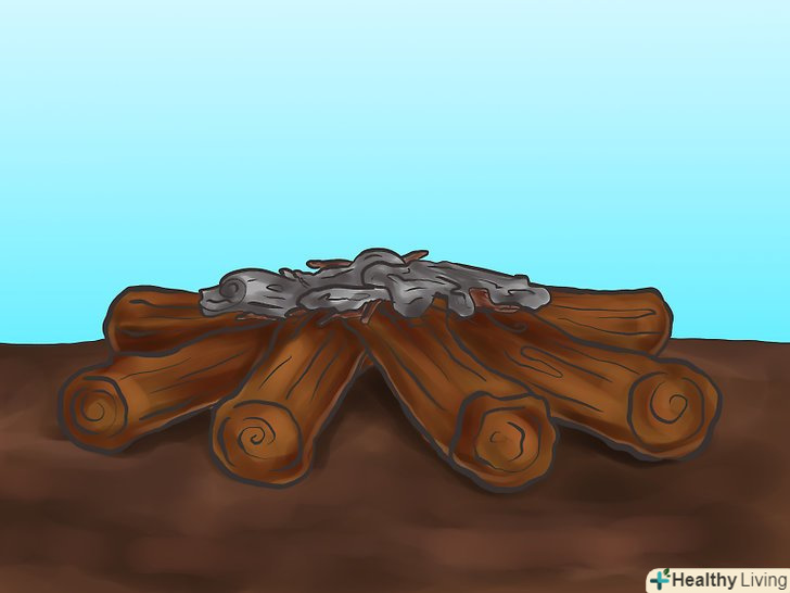 Розведіть вогонь. знайдіть поглиблення для багаття або велику ділянку, очищений від рослинності. Чи не розпалюйте багаття на ділянці з великою кількістю висячих гілок. Складіть хмиз, а зверху покладіть дрова так, щоб залишилося достатньо місця для кисню. Ось парочка простих методів: [9]- Для приготування їжі: спорудити вертикальний вігвам з хмизу, а над ним — ще більший вігвам з дров.