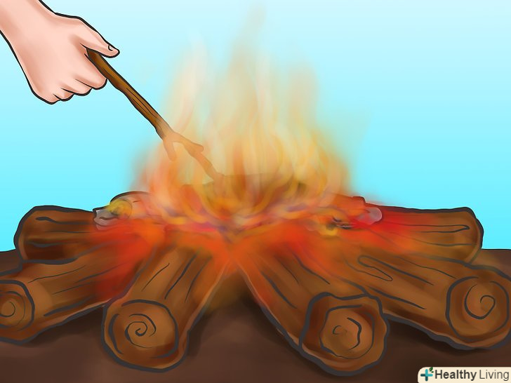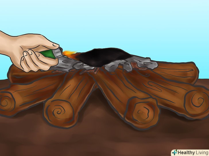 Засуньте труть під хмиз. як тільки труть загориться, засуньте його і обвуглену тканину під хмиз. Вогонь повинен перейти на хмиз, а потім і на самі дрова.