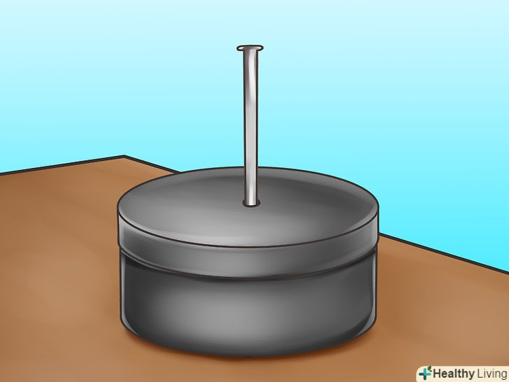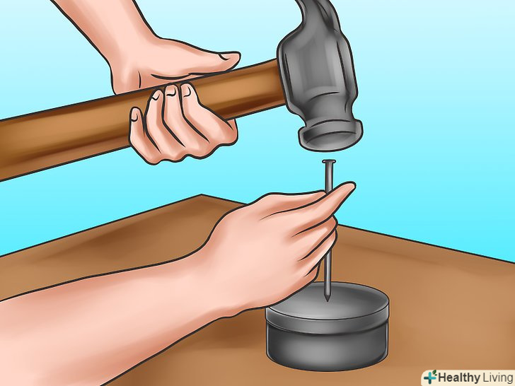 Пробийте отвір у кришці. Шилом або цвяхом і молотком пробийте дірку в кришці банки. Отвір повинен бути досить великим, щоб в нього можна було вставити кінчик ручки. Через цей отвір будуть виходити гази і гаряче повітря, не даючи банку вибухнути. [2]- Якщо отвір буде занадто великим, то в банку потрапить повітря і тканина загориться. Замість того щоб обвуглитися, вона перетвориться на попіл.