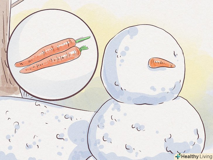 Зробіть сніговику ніс з моркви. візьміть довгу свіжу моркву (її можна купити в продуктовому магазині), щоб зробити сніговика ніс. Застроміть її спереду по центру голови сніговика. Переконайтеся в тому, що над і під морквою залишилося достатньо місця для створення очей і рота.- Ліплення сніговика — повністю творчий процес. Якщо у вас є щось інше, що, на вашу думку, може стати прекрасним носом сніговика, використовуйте цей предмет замість моркви.