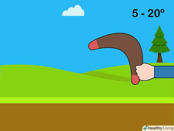 Запускайте Бумеранг вертикально з правильної позиції. Бумеранг слід кидати вертикально крученим верхнім кидком (як якщо б ви подавали бейсбольний м'яч), щоб він завертівся колесом в основній своїй площині. Для кидка тримайте бумеранг майже перпендикулярно до землі, відхиливши його вправо на 5-20 градусів (якщо ви правша) або вліво (якщо ви лівша). [14]- Той кут, під яким ви відхиляєте бумеранг називається його позицією. При використанні більш широкої позиції бумеранг слід кидати м'яко, тоді як більш вертикальна позиція вимагає більш потужних кидків. [15]
