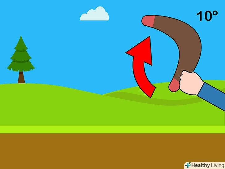 Кидайте бумеранг з належним кутом підйому. більшість бумерангів необхідно запускати на рівні очей з кутом підйому до Землі близько 10 градусів. Непоганим прийомом для цього служить вибір точки трохи вище рівня горизонту, наприклад, верхівки дуже далеко розташованого дерева, і здійснення кидка у напрямку до неї. [17]