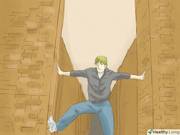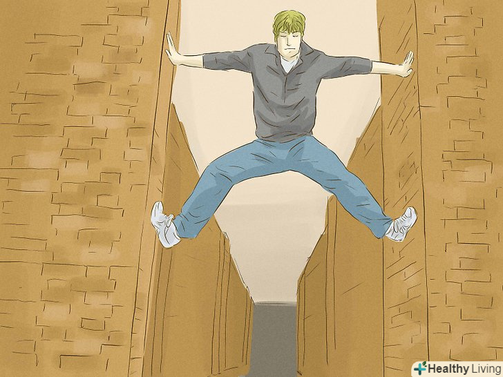 Упріться обома руками і обома стопами в стіни. ліва рука і стопа впираються в одну стіну, а права рука і стопа – в іншу. [2] Впирайтеся в обидві стінки одночасно з однаковою силою, щоб утримувати вагу свого тіла.
