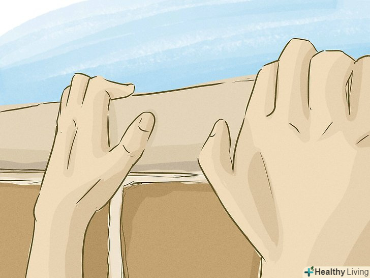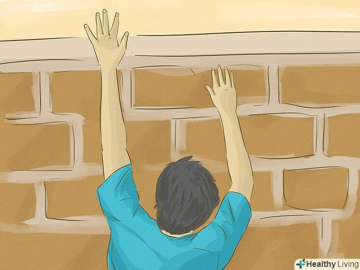 Схопіться за верхню частину стіни. використовуйте обидві руки і спробуйте зробити так, щоб на вершині стіни була якомога більша площа долоні. [1]- Хоча ваші ноги залишаються на землі, повинно здаватися, що ви бовтаєтеся, зачепившись руками. Вони повинні залишатися витягнутими, коли ви беретеся за стіну.