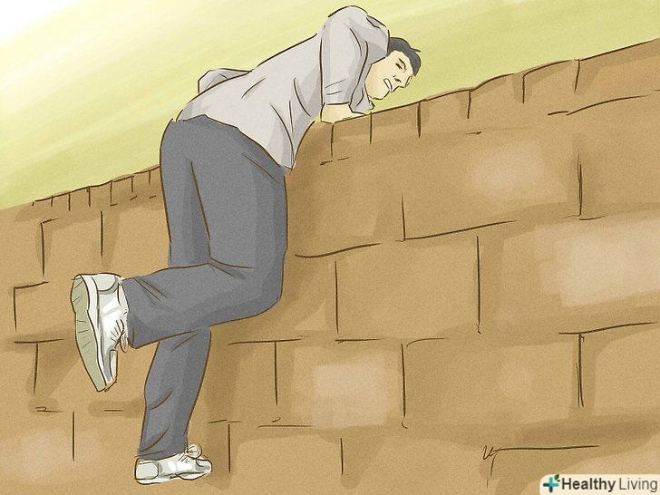 Перекиньте задню ногу вперед. перекиньте задню ногу на вершину стіни і завершіть підйом. Якщо ви на даху, встаньте. Якщо ви піднімаєтеся на окремо стоячу стінку, можете ковзнути на іншу сторону стіни і витягнути ноги під собою, опускаючись вниз.