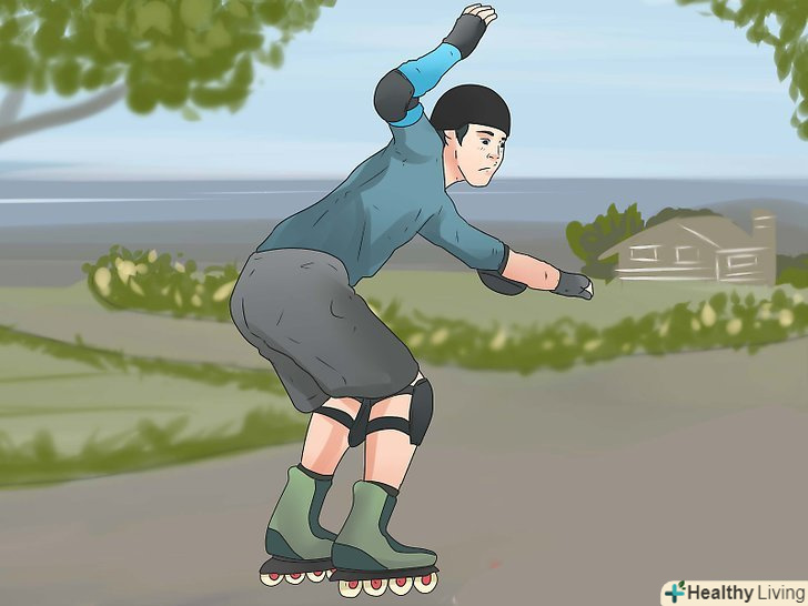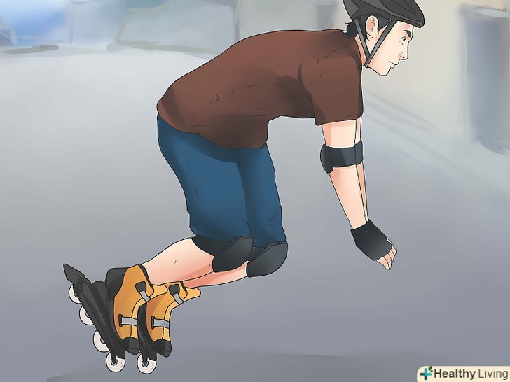 Навчіться правильно падати. коли ви падаєте, зігніть коліна, розправте руки і падайте вперед, щоб утримати себе на захисних щитках зап'ясть і ковзаючи зупинитися. Якщо ви все зробите правильно, то впадете на наколінники і налокітники та інші подушечки і зможете встати і спробувати заново.- Кожен любитель роликових ковзанів коли-небудь падає. Зазвичай, це відбувається не на самому початку тренувань, а в момент, коли ви вже стали досить добре і сміливо кататися. Важливо постійно надягати ваші захисні подушечки для того, щоб якомога краще себе убезпечити.