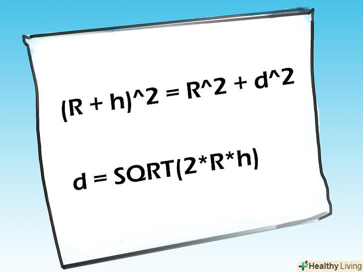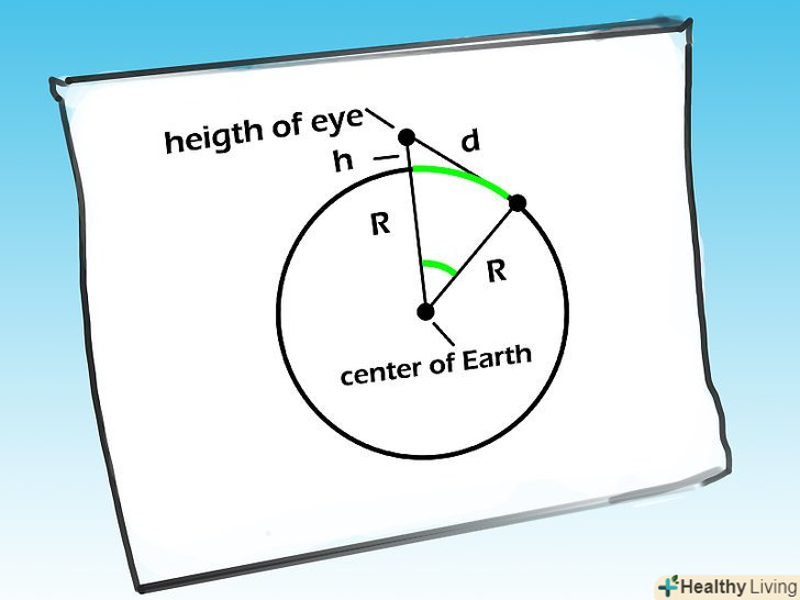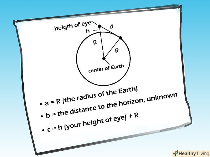 Усвідомте суть цього методу. в його основі трикутник з наступними вершинами: точка спостереження (ваші очі), точка на горизонті (на яку ви дивитеся) і центр Землі.- Знаючи радіус Землі і вимірюючи висоту від землі до ваших очей (плюс висота височини, якщо необхідно), невідомим залишається тільки відстань між точкою спостереження і точкою на горизонті. Так як трикутник є прямокутним, то в обчисленнях можна використовувати теорему Піфагора: a 2