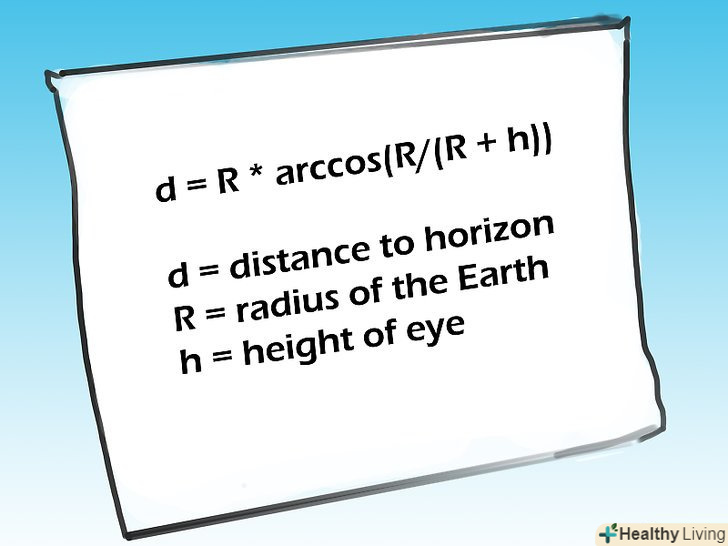 Витягніть квадратний корінь і ви отримаєте відстань до горизонту (в кілометрах). обчислена відстань являє собою пряму лінію від ваших очей до горизонту.- Фактична відстань до горизонту (при подорожі по поверхні Землі) буде більше через кривизну поверхні. Перейдіть до наступного розділу для більш точного обчислення відстані до горизонту.
