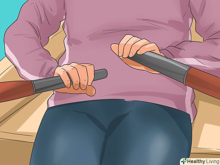 Зміцнюйте руки. більшість професійних веслярів більше концентрується на опрацюванні самого торсу і ніг, так як на них припадає основне навантаження, але корисно буде зміцнити і верхню половину тіла в цілому, включаючи руки. Крім класичних планок, існує ще кілька вправ, які дозволяють прокачати м'язи рук. [3]- Планки-віджимання. Почніть з пози планки, але в цей раз упріться в підлогу не передпліччями, а долонями, розташувавши їх безпосередньо під плечима. Відштовхніться руками від підлоги, зберігши опору тільки на долоні і пальці ніг. Потім опустіть корпус назад вниз, утримуючи лікті близько до тіла (вони не повинні розходитися в сторони). Опускаючись, не дозволяйте тілу торкатися підлоги, потім знову підніміться в планку з опорою на долоні і пальці ніг.