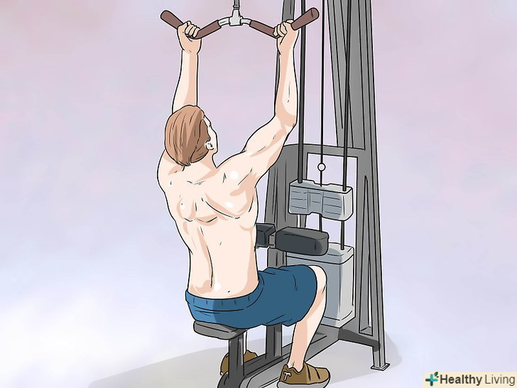 - Жим донизу зворотним хватом. Дана вправа виконується на блочному тренажері. Сядьте в тренажер і дотягніться до поперечини над головою, схопитеся за неї зворотним хватом. Далі повільно потягніть поперечину вниз, більше використовуючи силу верхньої половини тіла, ніж рушійний імпульс. Опустіть поперечину до рівня грудей. Потім повільно поверніть її назад у вихідне положення і повторіть вправу.