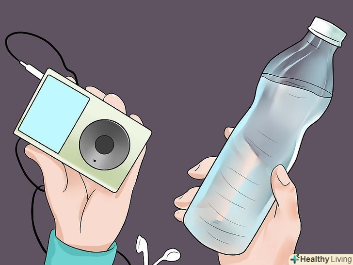 Візьміть Ipod або MP3-плеєр і пляшку води. якщо ви хочете добре провести час візьміть з собою на прогулянку плеєр і воду. Музика спонукає вас рухатися, а вода допоможе уникнути зневоднення (що особливо важливо в жарку погоду). Вам буде складно продовжувати ваш шлях, якщо ви будете відчувати спрагу або вам буде нудно.- Якщо ви збираєтеся на довгу прогулянку, прихопіть з собою закуски. Пакет горіхів, плитка граноли або фрукти-корисні закуски, які допоможуть вам відновити сили під час ходьби.