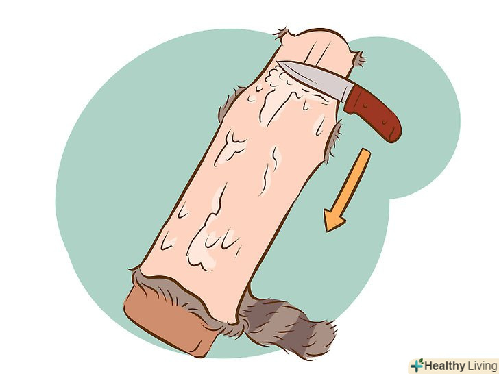 Зробіть прямий надріз з внутрішньої сторони від однієї задньої лапи до іншої. для початку, зробіть надріз на шкірці між ніг тварини, з внутрішньої сторони від однієї щиколотки до іншої. Уявіть собі, що це внутрішній шов на джинсах, і з'єднайте свій надріз на щиколотках у формі літери "V".- Виріжте «манжети», провівши своїм ножем навколо кожної «щиколотки» єнота, звільняючи шкуру. Це дозволить вам почати стягувати шкуру точно вниз.