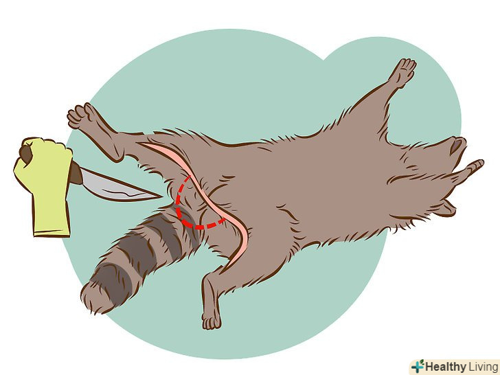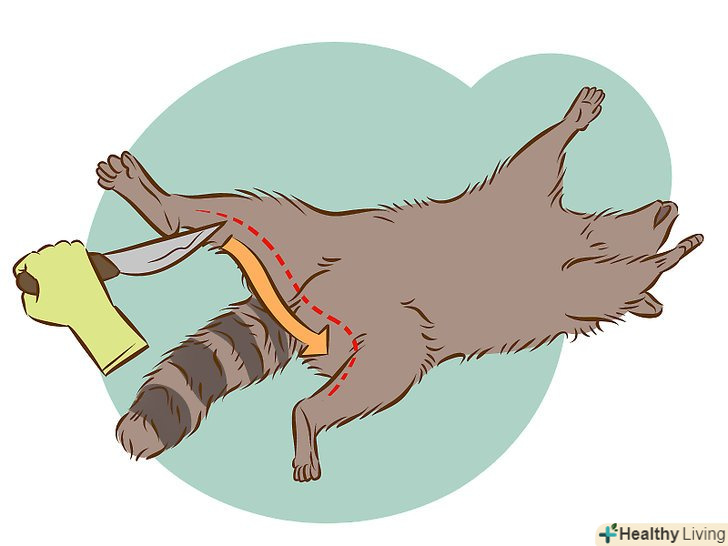 Спочатку видаліть шкуру за допомогою здирання. коли перед вами стоїть задум, головною метою якого є збереження шкури, то існують два способи для його здійснення. Обробка передбачає видалення шкури з тушки, починаючи з задніх лап і просуваючись вперед, стягуючи її одним великим шматком. Це найкращий варіант дій. Зазвичай не рекомендують, щоб ви спочатку видаляли органи, так як це може зіпсувати цінну шкуру.- Відкрите обдирання шкури зазвичай використовується тільки на бобрах і деяких інших тварин. Це включає в себе видалення органів в першу чергу, через вертикальний надріз на тілі тварини, потім видаляються шкура і хвіст одночасно. Для єнотів подібне не рекомендується.