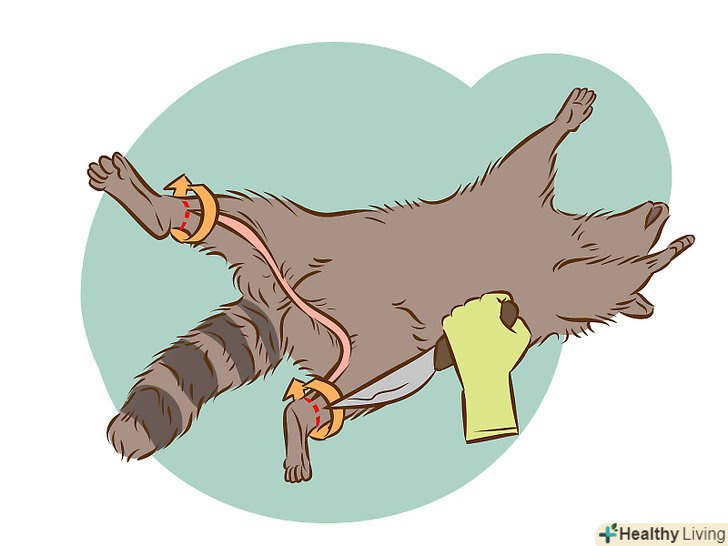 - Виріжте «манжети», провівши своїм ножем навколо кожної «щиколотки» єнота, звільняючи шкуру. Це дозволить вам почати стягувати шкуру точно вниз.