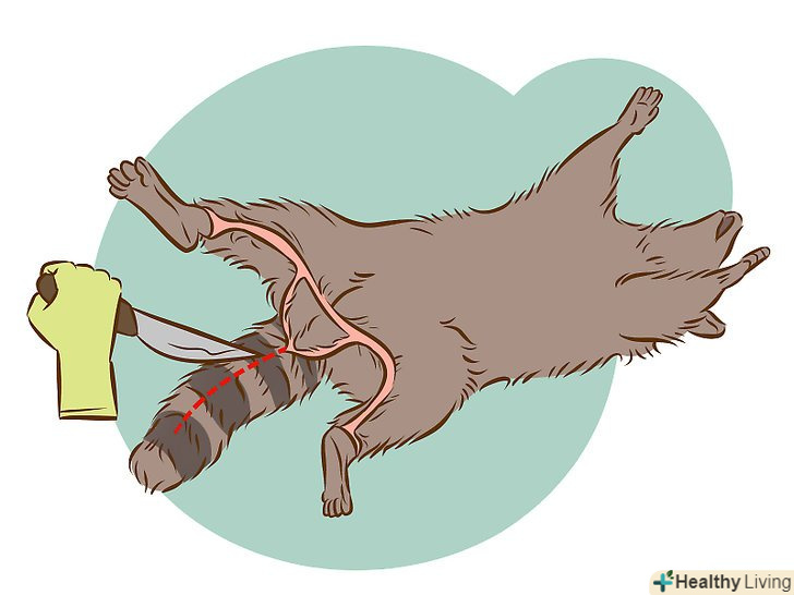 Зробіть надріз навколо заднього проходу. зробіть надріз діаметром близько 2,5 см навколо заднього проходу, починаючи біля основи хвоста, там, де він з'єднується з торсом. Звичайно, краще перебувати весь час в рукавичках, поки ви здираєте шкуру з єнота.- Будьте дуже обережні в цей момент, не ріжте занадто глибоко і не потрапте в плоть. Останнє, що ви хочете зробити, це проколоти кишечник прямо навколо заднього проходу, що може зіпсувати хутро та м'ясо, якщо ви бажаєте його використовувати.