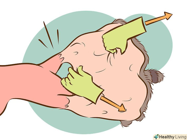 Видаліть залишок жиру. після видалення жиру з хвоста, соскребайте прямо вгору до середини шкури, по лінії. Ідіть весь час вгору до тих пір, поки ви не видалите все з вузької смуги посеред шкури і її голови. Потім повертайтеся назад і зіскрібайте поперек, розширюючись по сторонах. Це допоможе почати процес розтяжки і розрівнювання шкури. [4]- Продовжуйте роботу з сильним натиском і повільним соскребанием всього жиру і інших шматочків. Це не повинно зайняти багато часу, але повинно бути ретельно проведено. Якщо ви що-небудь пропустите, ви ризикуєте тим, що шкура загниет і зіпсується.