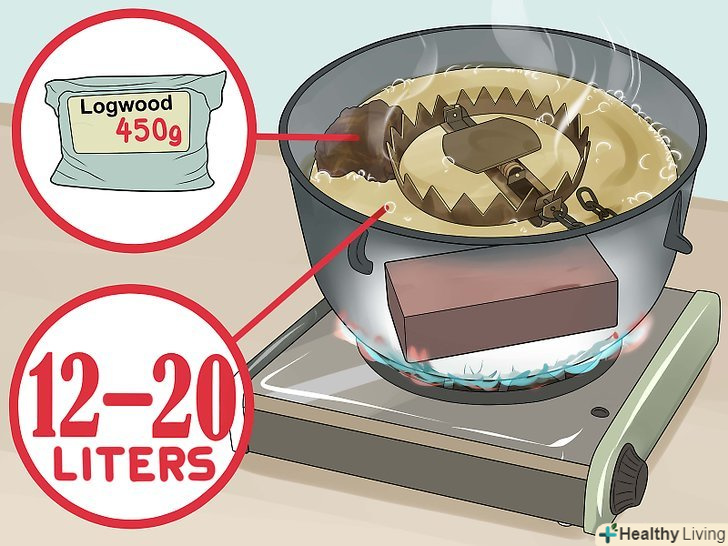 - Всипте 450 г кампешевого екстракту в 12-20 л води. Спочатку доведіть суміш на плиті до активного кипіння, а потім зменшіть полум'я, щоб фарба ледь кипіла.
