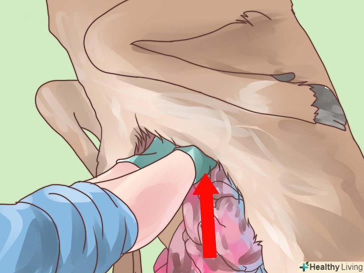 Почніть з заднього проходу. візьміть невеликий гострий ніж і обережно зріжте кільце шкіри, яке знаходиться навколо ануса для того, щоб відокремити шкуру. Це робиться з метою відокремити анус і товсту кишку від шкури, щоб захистити м'ясо від забруднення екскрементами оленя. Акуратно потягніть анус разом з товстою кишкою (кишками) на кілька сантиметрів від туші оленя. Якщо хочете, можете зв'язати їх у вузол.
