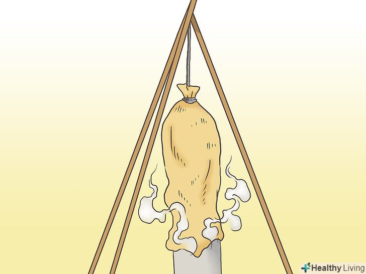 Копчення шкури. це останній етап в процесі диблення народним способом. Зшийте шкуру з боків і у верхній частині таким чином, щоб вийшов мішок. Особливо ретельно зашийте верхню частину, щоб дим міг залишатися всередині. Викопайте яму розміром 15 см глибиною і 30 см в діаметрі і розмістіть мішок з шкури над ямою відкритою стороною вниз, сперши верхню частину об кінець палиці (на зразок купольної намети). Усередині мішка в ямці розпаліть маленький багаття так, щоб дим від багаття піднімався і вбирався в шкуру.- Коли багаття догорить і почне йти дим, додайте в багаття джерело диму (гнилі, мокрі або зелені гілочки). Закрийте відкриту частину мішка і залиште невелику щілину для того, щоб можна було підкидати гілки в багаття.
