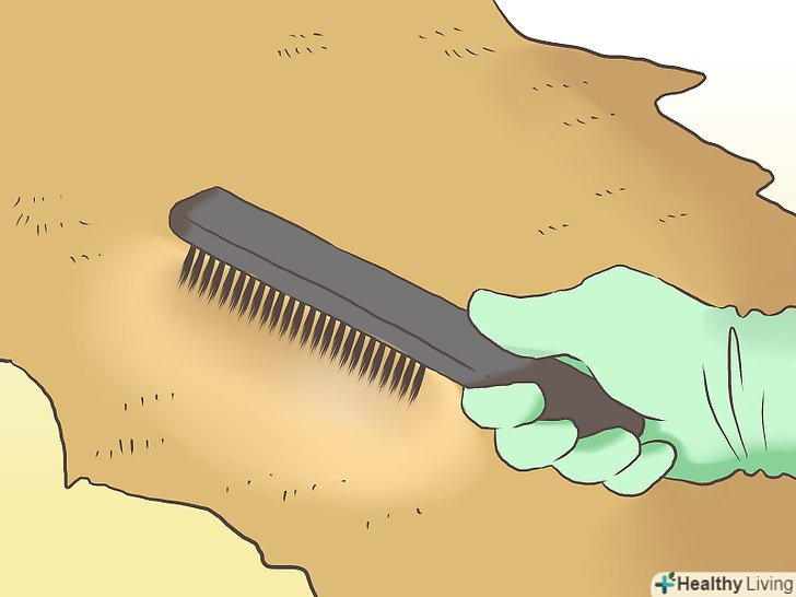 Розтягніть шкуру. щоб закінчити процес вичинки, повісьте шкуру на спеціальний настил для розтягування шкур або дерев'яну раму. Перемістіть шкуру в тінь подалі від сонця, щоб дати їй там просохнути. Через кілька днів шкура стане сухою і еластичною. Зніміть шкуру з настилу і пройдіться по мездрі металевою щіткою, щоб надати їй вигляд замші. Тепер дайте шкірі остаточно висохнути, що займе ще кілька днів. [4]