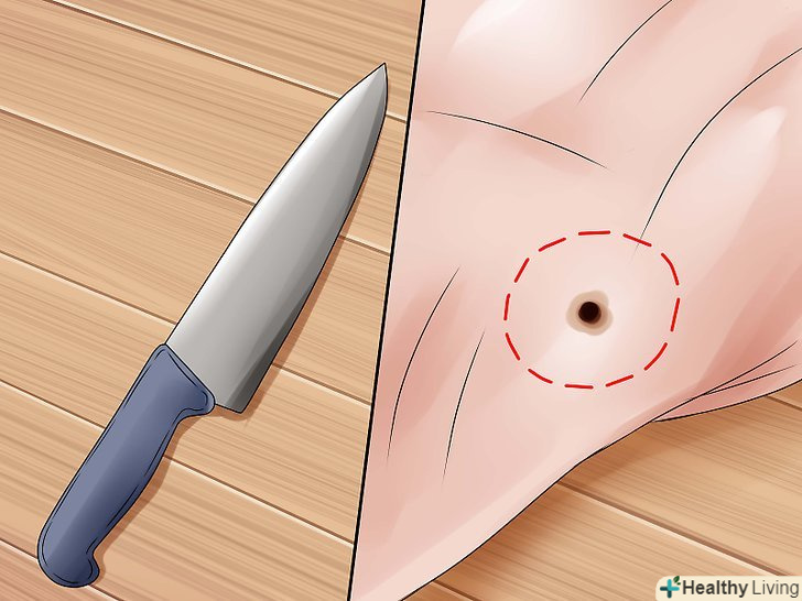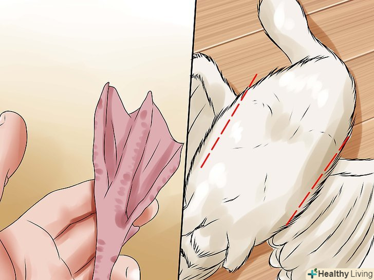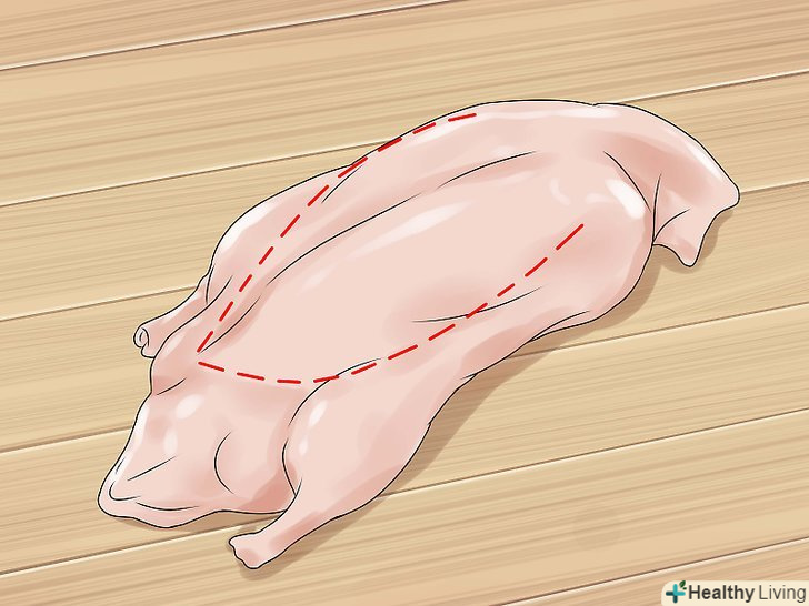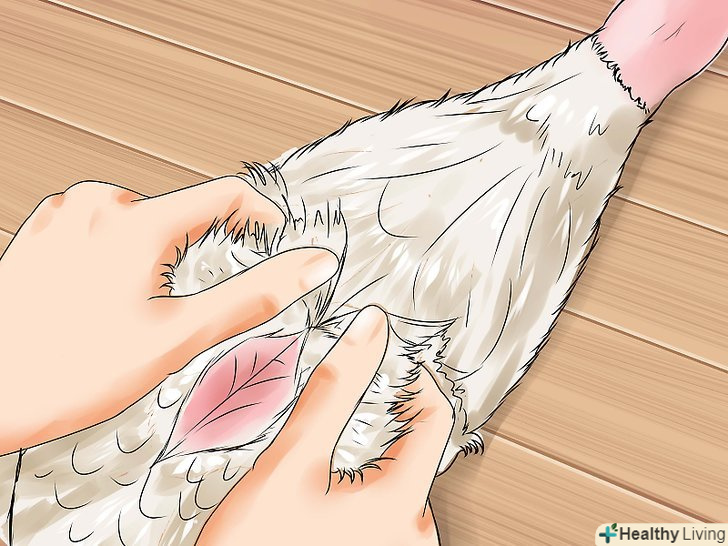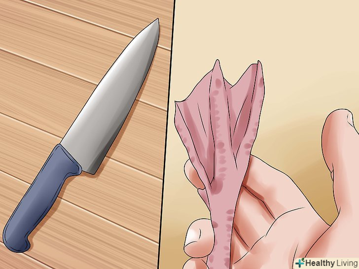 Зробіть надріз під ребром птиці. на південь від лінії ребра немає м'яса, тому зазвичай найкращий спосіб витягти нутрощі – це зробити надріз біля основи грудей під ребром, щоб відокремити порожнину з органами від хорошого м'яса. Проведіть своїм ножем уздовж нижньої частини грудної кістки, роблячи рівні і неглибокі надрізи. Коли ви дійдете до внутрішньої сторони, міцно стисніть одну половину птиці і обережно потягніть її, щоб витягнути нутрощі. Кишки повинні вийти одночасно.- Ви можете витягнути серце і печінку, які можуть бути прикріплені до черевної порожнини, окремо і відокремити м'язовий шлунок, який знаходиться вище. Ви можете з'їсти печінку, якщо видалите жовчний проток - він зеленуватого кольору і схожий на таблетку у формі капсули. Серце теж можна вживати в їжу, але воно менше за розміром. [3]